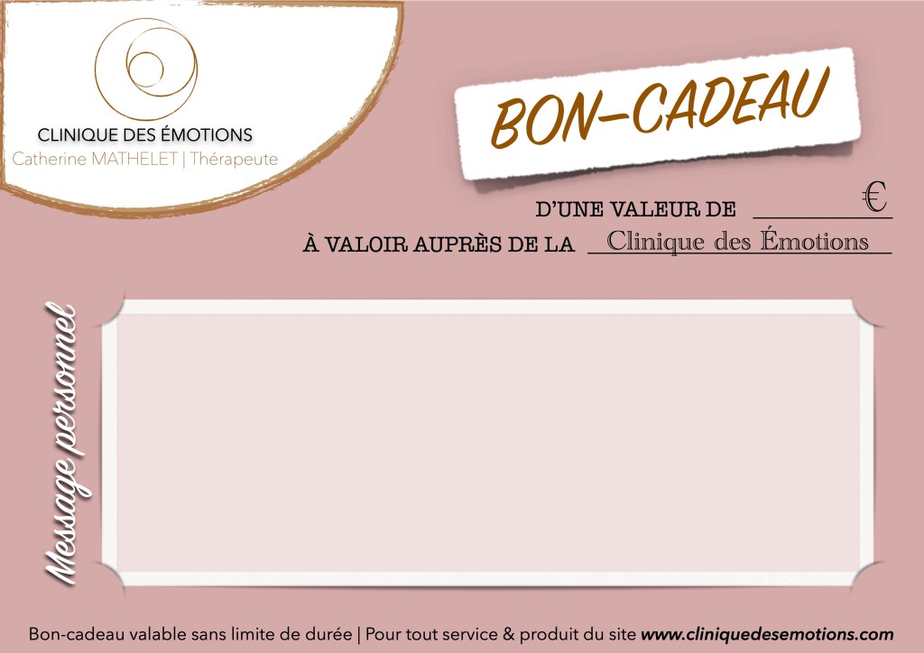 Offrir un BON-CADEAU CERTIFIÉ ET PERSONNALISÉ à une personne qui compte vraiment, c’est lui donner l’élan et le choix de prendre soin d’elle-même. Ainsi, le destinataire du bon-cadeau pourra bénéficier d’une somme que vous avez choisie. Ce montant est valable en permanence, sur l’ensemble des services et produits proposés par la Clinique des Émotions (Consultation, Atelier, Parchemantra®, Accompagnement…). À sa guise, à son rythme!